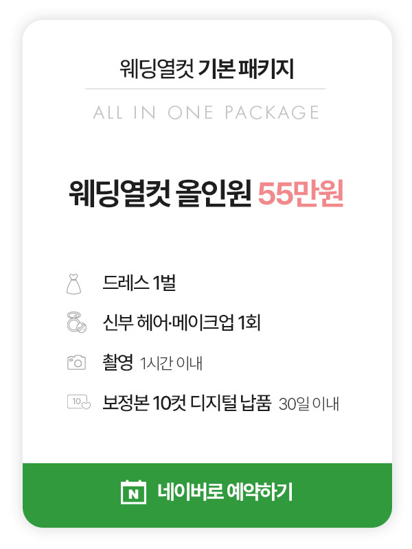 드레스 + 메이크업 + 화보 10컷을 한번에, 올인원 55만원
